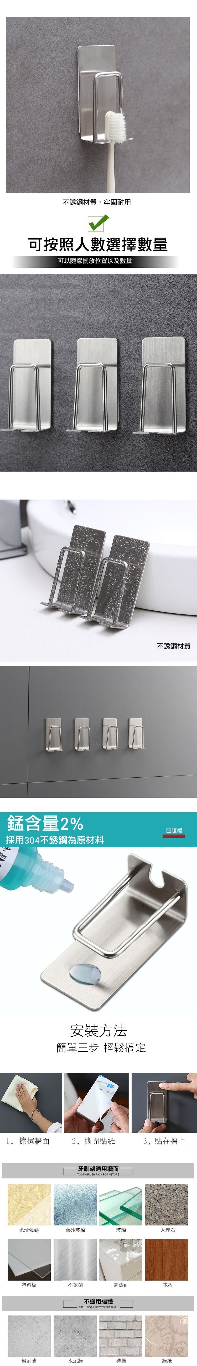防水防潮,可以完全不留痕跡在牆壁上,且由於靜電平均受力的關係,承重力大而穩固,無論是木牆、水泥牆、玻璃、不鏽鋼、大理石、磁磚、牆紙...都好用,浴室裡放置牙刷、漱口杯、牙膏...都好吊掛,讓室內更加整潔有條理!