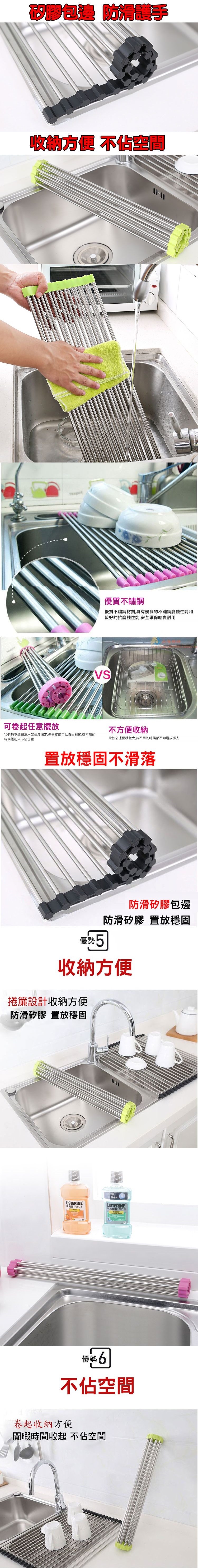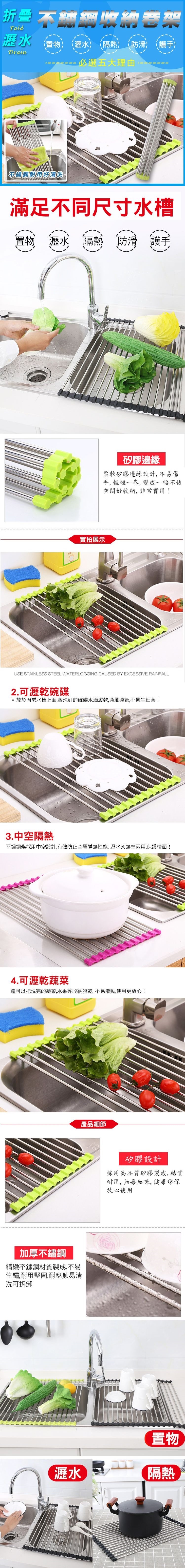 折疊瀝水不鏽鋼收納卷架,可放於廚房水槽上面,可將洗好的碗盤水滴瀝乾,通風透氣,不易有細菌。還可以把洗完的蔬菜、水果瀝乾,不易滑動,使用更放心。不銹鋼條採中空設計,有效防止金屬導熱性能,瀝水架、隔熱墊兩用,保護桌面!