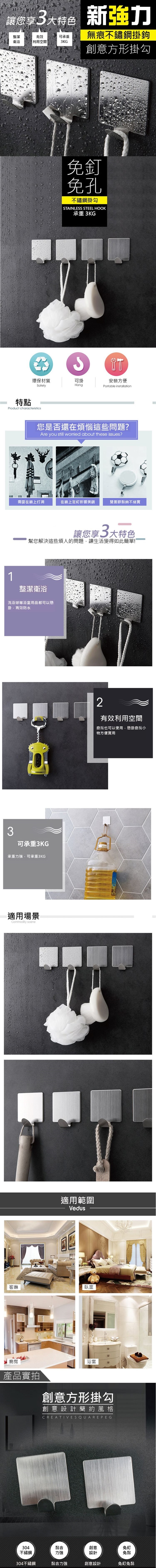 新強力無痕不鏽鋼掛鉤 採用304不鏽鋼材質,比舊款更加大,黏性更升級,五層復合剛高耐磨耐腐蝕,經久使用不變形,鏡面拋光更易於清洗,精緻的作工美觀實用兼具,超強黏性遇水不掉,承重強,無論是平滑或是馬賽克等凹凸不平牆面皆可使用,廚房衛浴等掛取物品使用更便利!