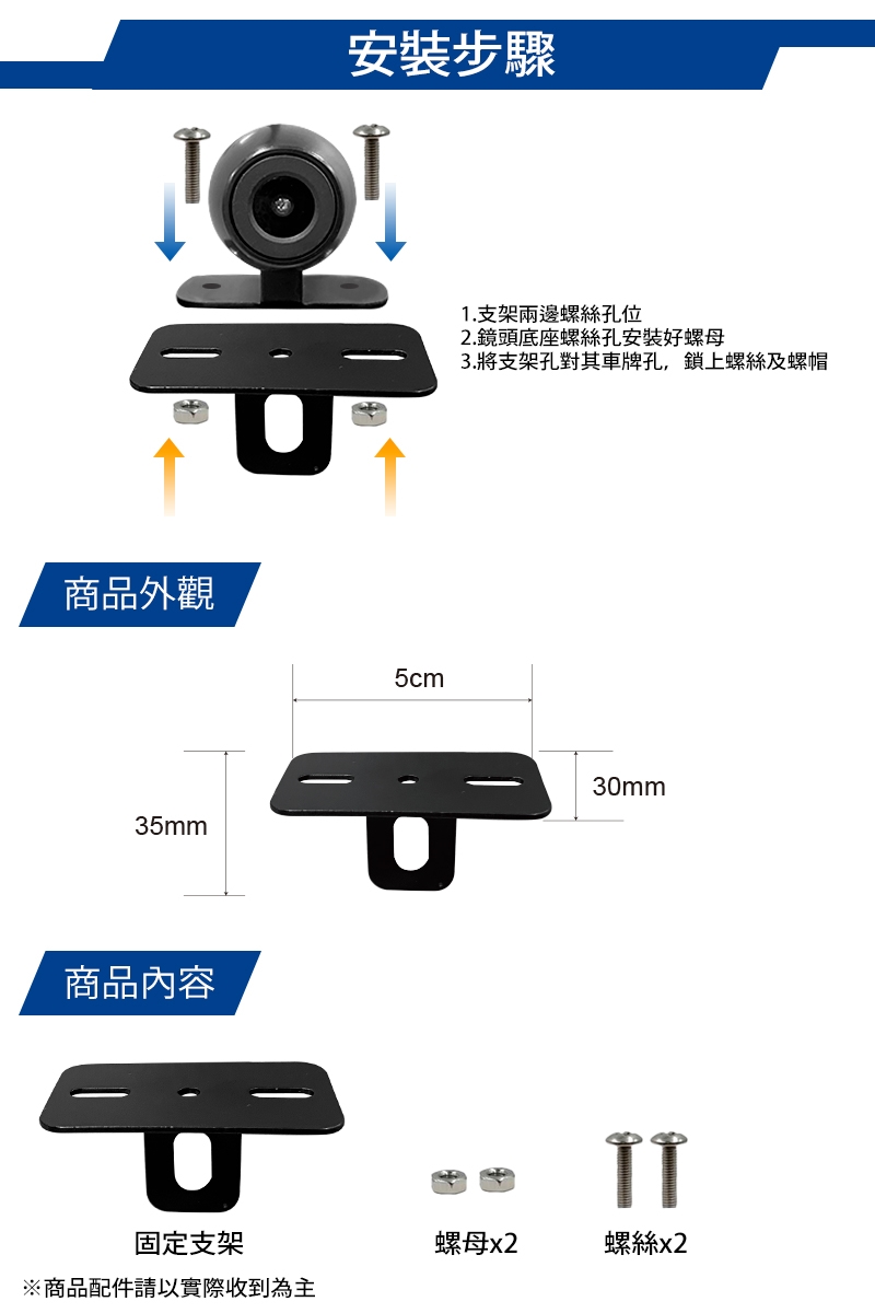 商品詳細介紹 【商品特色】免鑽孔,不用在心愛的機車上鑽孔體積小、輕巧且易安裝可固定機車行車記錄器鏡頭讓拍攝畫面更穩定 【商品規格】型號:機車行車記錄器固定支架保固期限/保固範圍:本產品為耗材,無保固期配件:固定支架x1、螺母x2 螺絲x2尺寸:30mm x 50mm x 35mm 使用方法說明 如商品適用說明 注意事項 本產品為耗材,無保固期