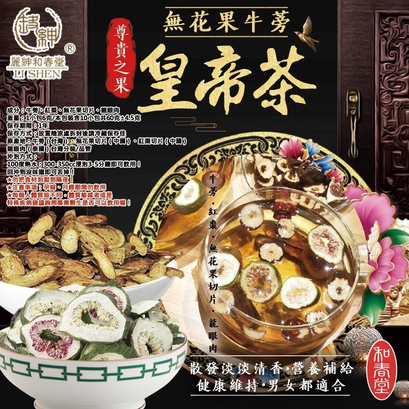 產地:牛蒡(台灣)、無花果切片(中國)、紅棗切片(中國)、龍眼肉(泰國)台灣分裝/品管
