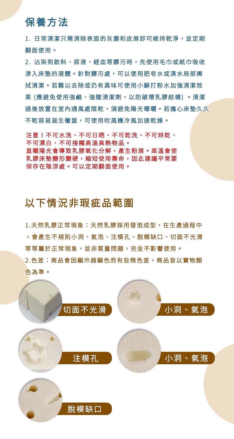 - 天然乳膠正常現象:天然乳膠採用發泡成型,在生產過程中,會產生不規則小洞、氣泡、注模孔、脫模缺口、切面不光滑等等屬於正常現象,並非質量問題,完全不影響使用。