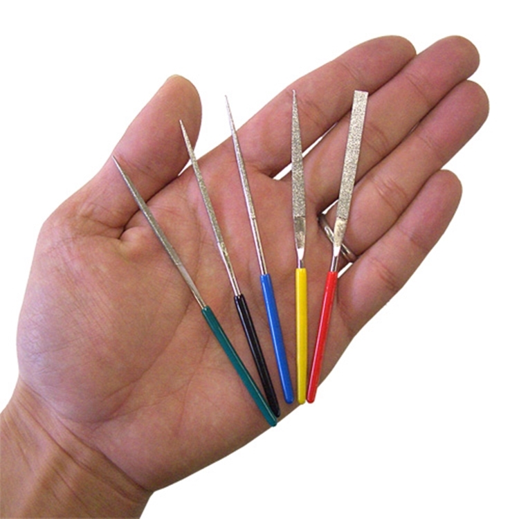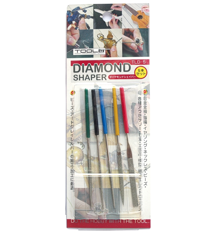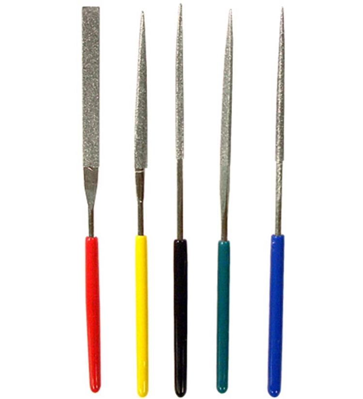 ●內有五隻不同形狀的鋼製圓柱打磨棒(平型/半丸/四角/三角/丸型各1支;鑽石粒徑#240)且每支握把顏色都不相同,讓您可以輕易分辦。