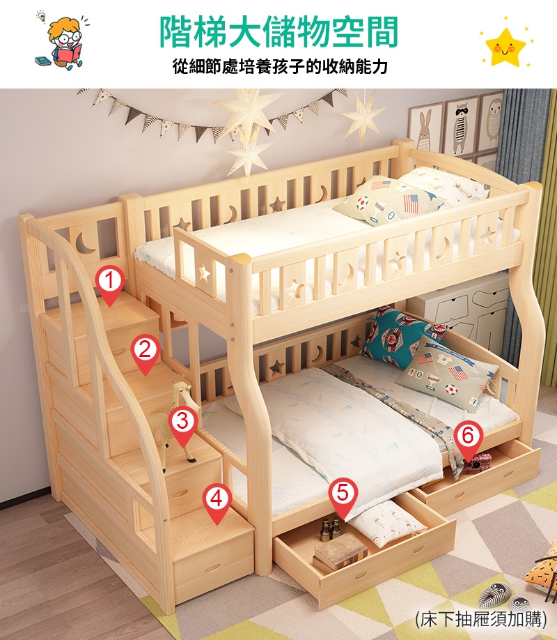 安全可靠:採用歐盟最高兒童家具專用木材等級SF級製成,堅固耐用,無毒無害,給孩子一個安全健康的睡眠環境。