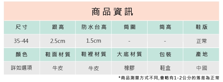 2.鞋類商品依功能及用途之不同,鞋底各有其止滑係數之個別不同,使用鞋類商品請用於正常平坦之路面,非雨鞋或雨靴類商品,請避免穿著於下雨濕滑路面上行走。