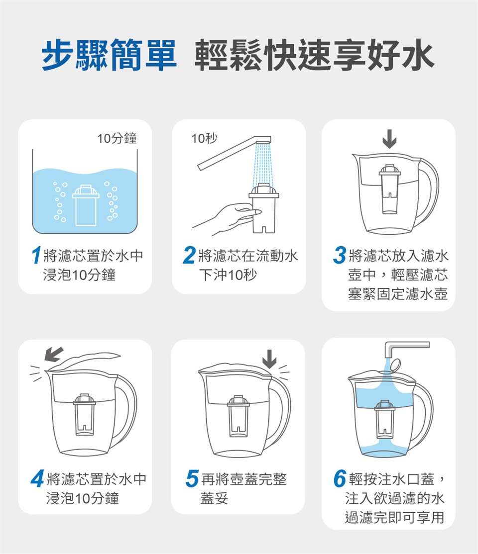 首次使用請打開濾水壺上蓋,將濾芯置入壺中注水浸泡10分鐘後,再將濾芯取出以流動水沖洗10秒,再置入濾水壺中,過濾2次後即可開始使用。