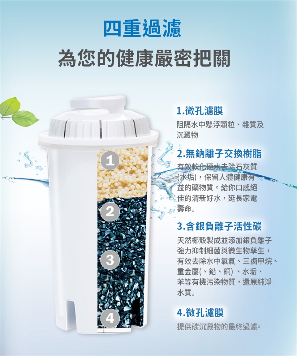 首次使用請打開濾水壺上蓋,將濾芯置入壺中注水浸泡10分鐘後,再將濾芯取出以流動水沖洗10秒,再置入濾水壺中,過濾2次後即可開始使用。