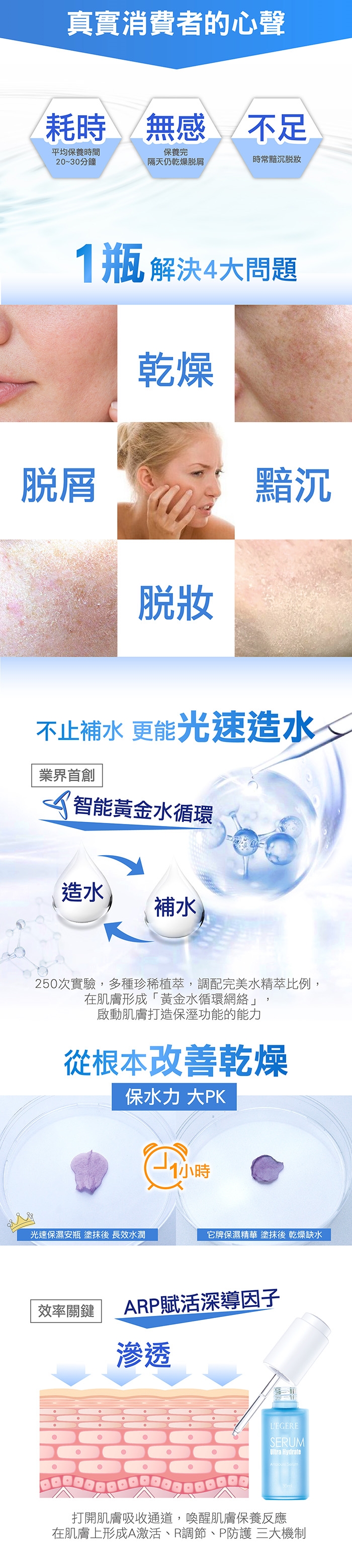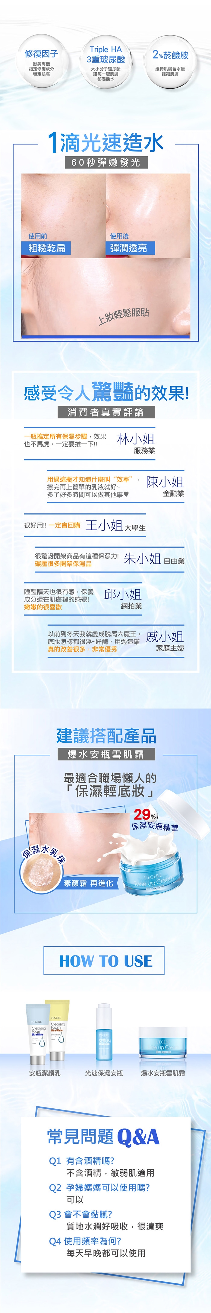商品詳細介紹 使用方法說明 1.潔淨肌膚後,取適量塗擦於全臉輕輕按摩至吸收即可,請避開眼周。2.欲濕敷時,取適量將化妝棉或面膜充分浸濕,敷於肌膚乾燥處五分鐘,即可有良好潤澤保濕效果。 注意事項 使用後如有任何不適,應立即停止使用並洽詢專科醫生。請置於孩童拿取不到之處並避免高溫及陽光照射。