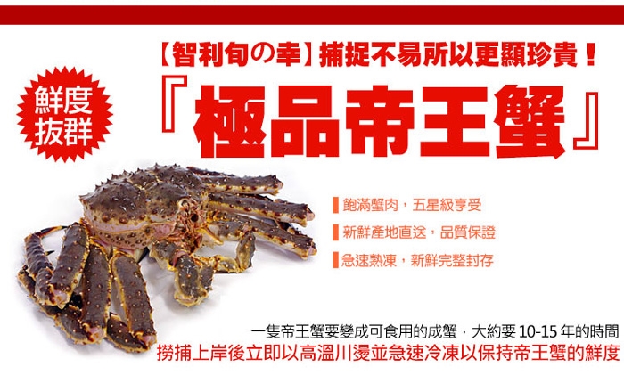 1. 帝王蟹清蒸料理:將帝王蟹分解後,可加入蒜頭、薑絲清蒸10分鐘,因智利帝王蟹以經高溫處理過,因此只要稍微清蒸就可食用。
