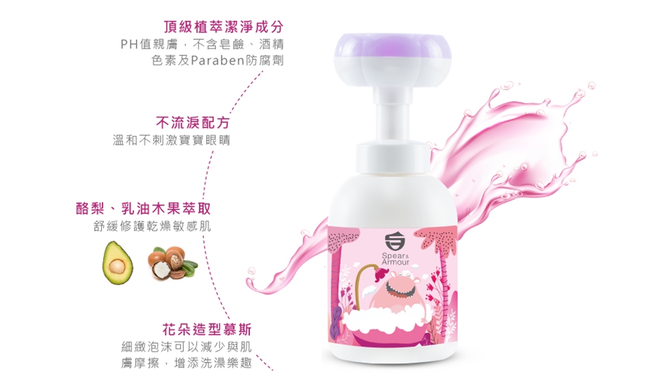 用溫水弄濕寶寶頭髮及身體,保持瓶身正立,手掌心朝下,平放在瓶蓋上,往下垂直按壓一次,並按壓出適量慕斯,均勻塗抹於頭髮及身體,輕輕搓揉後,再以清水沖洗乾淨即可。