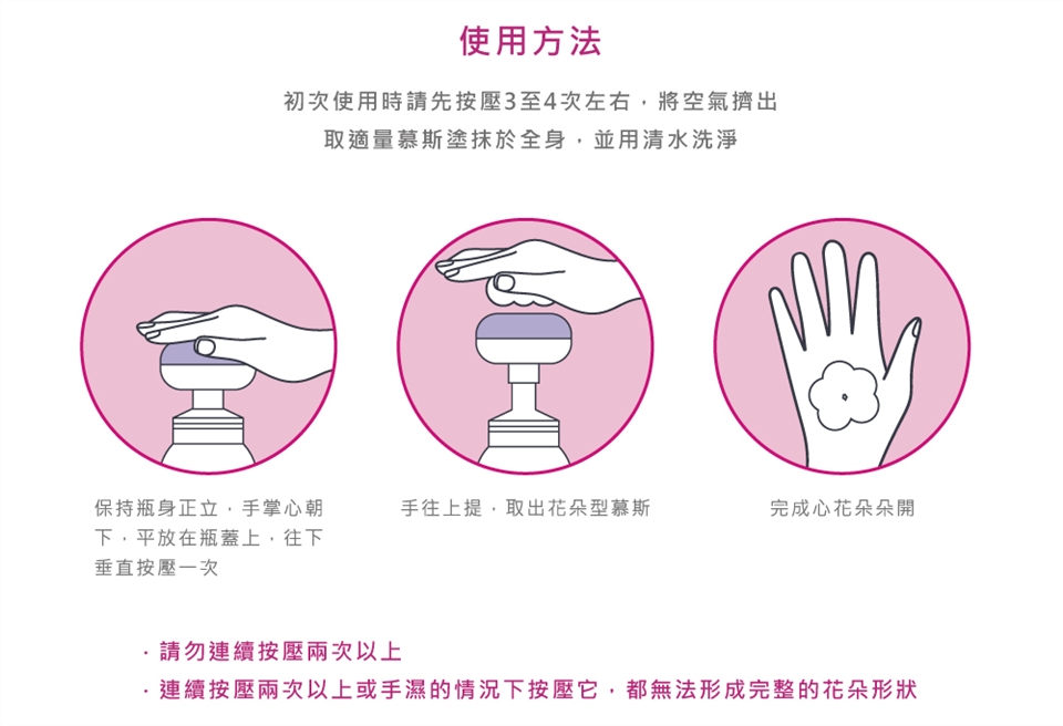 ★請勿在直接接觸水的情況下使用按壓頭,又或搖晃及傾斜瓶身,可能導致無法正常起泡和壓頭無法成花朵形狀★