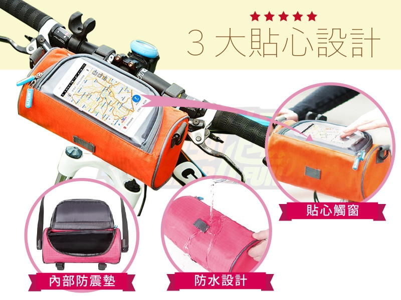 騎自行車時,隨身小物品都可以裝進去,手機有一個觸屏放置區,可以當導行使用,隨時可以掌控路況,防水牛津布有一般小雨貴重物品才不會淋濕