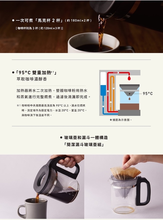 (1)「95℃雙重加熱」萃取咖啡濃醇香。