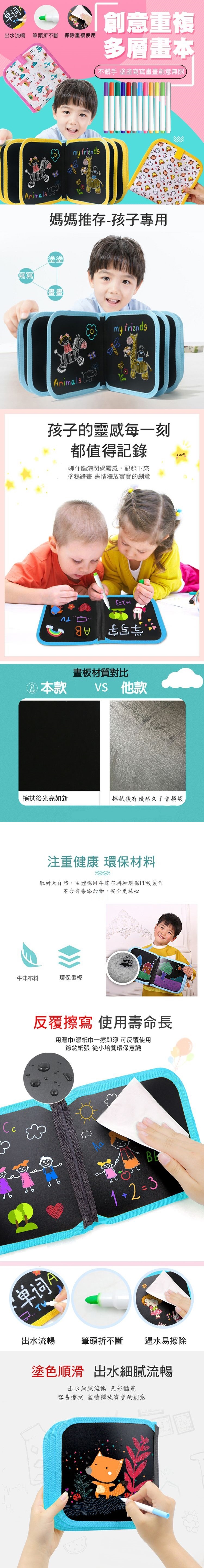 新不髒手創意重複多層畫本,畫本材質更升級更耐用款,讓孩子愛上畫畫,發揮無限創意和想像力!畫畫不髒手,好清理可重覆使用,外出攜帶超方便!牛津布防水耐用,12色水粉畫筆書寫流暢,使用濕巾可輕鬆擦除塗鴉,快來激發孩子的想像力!