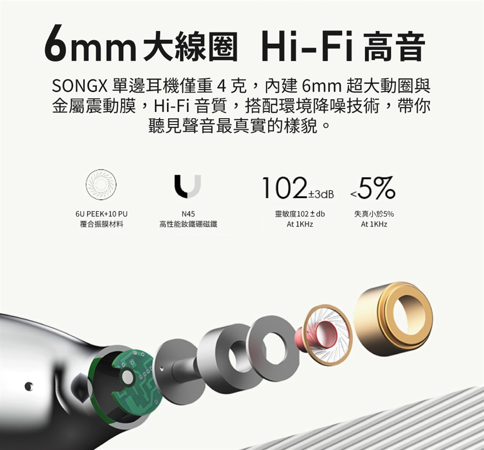 內建 6mm 超大動圈與金屬震動膜,調教出 Hi-Fi 音質
