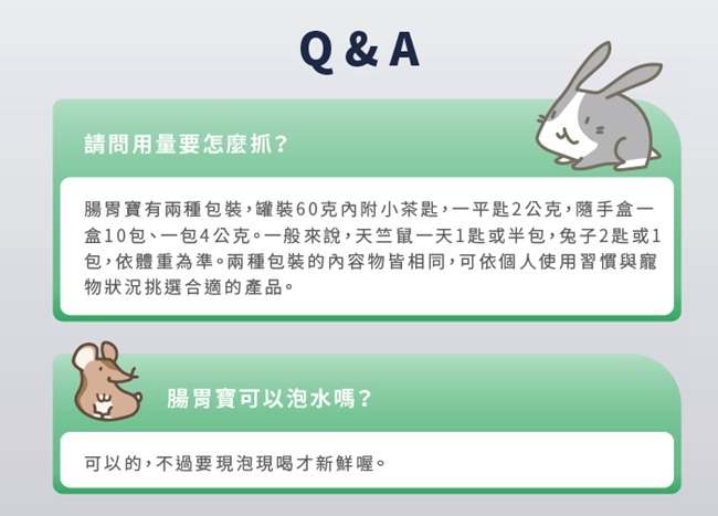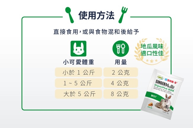 可直接餵食、加入飼料或代奶中(內附茶匙, 每平匙2g)。