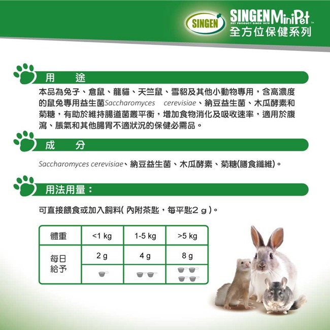 商品名稱:SINGEN 信元發育寶 鼠貂兔用開胃保健順暢整腸益生菌配方-60g/罐-地瓜風味 小寵物保健食品 小寵物保健 特寵保健