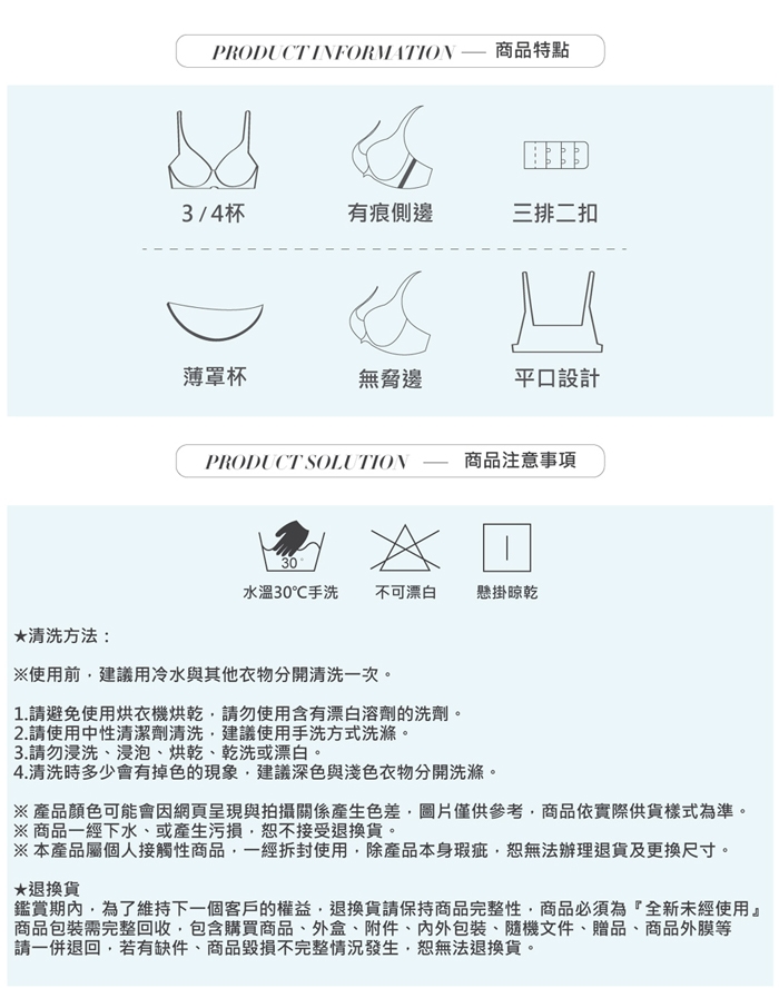 ※ 本產品屬個人接觸性商品,一經拆封使用,除產品本身瑕疵,恕無法辦理退貨及更換尺寸。