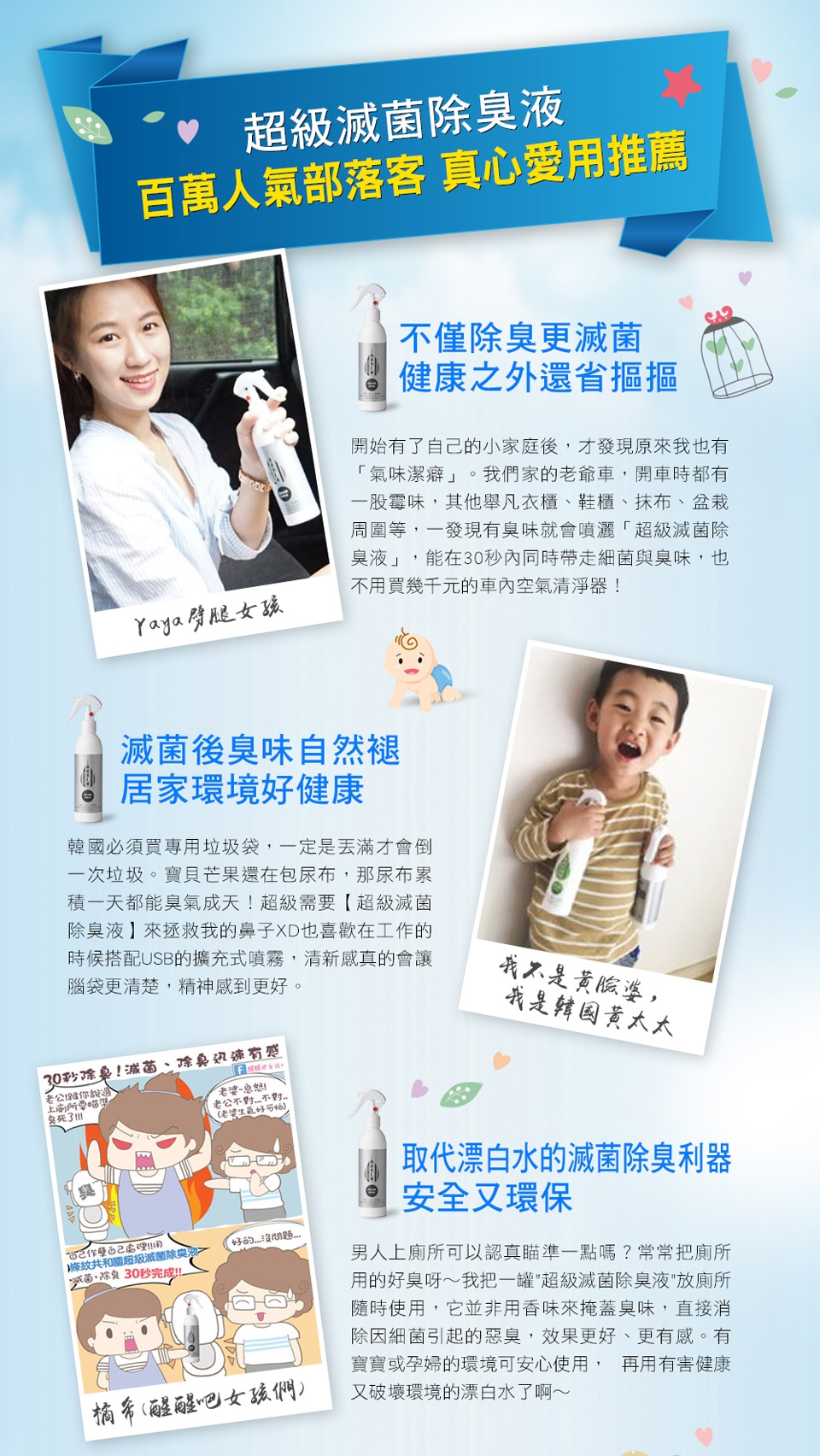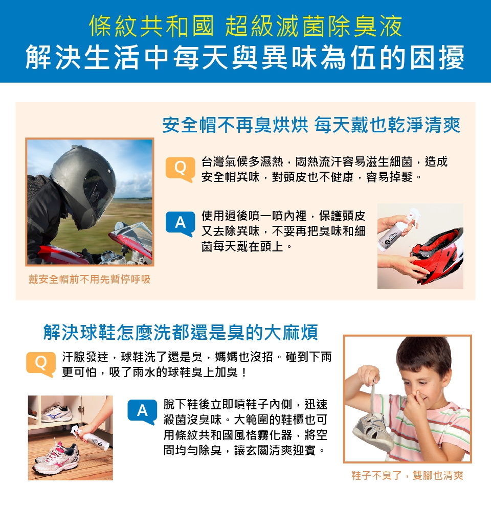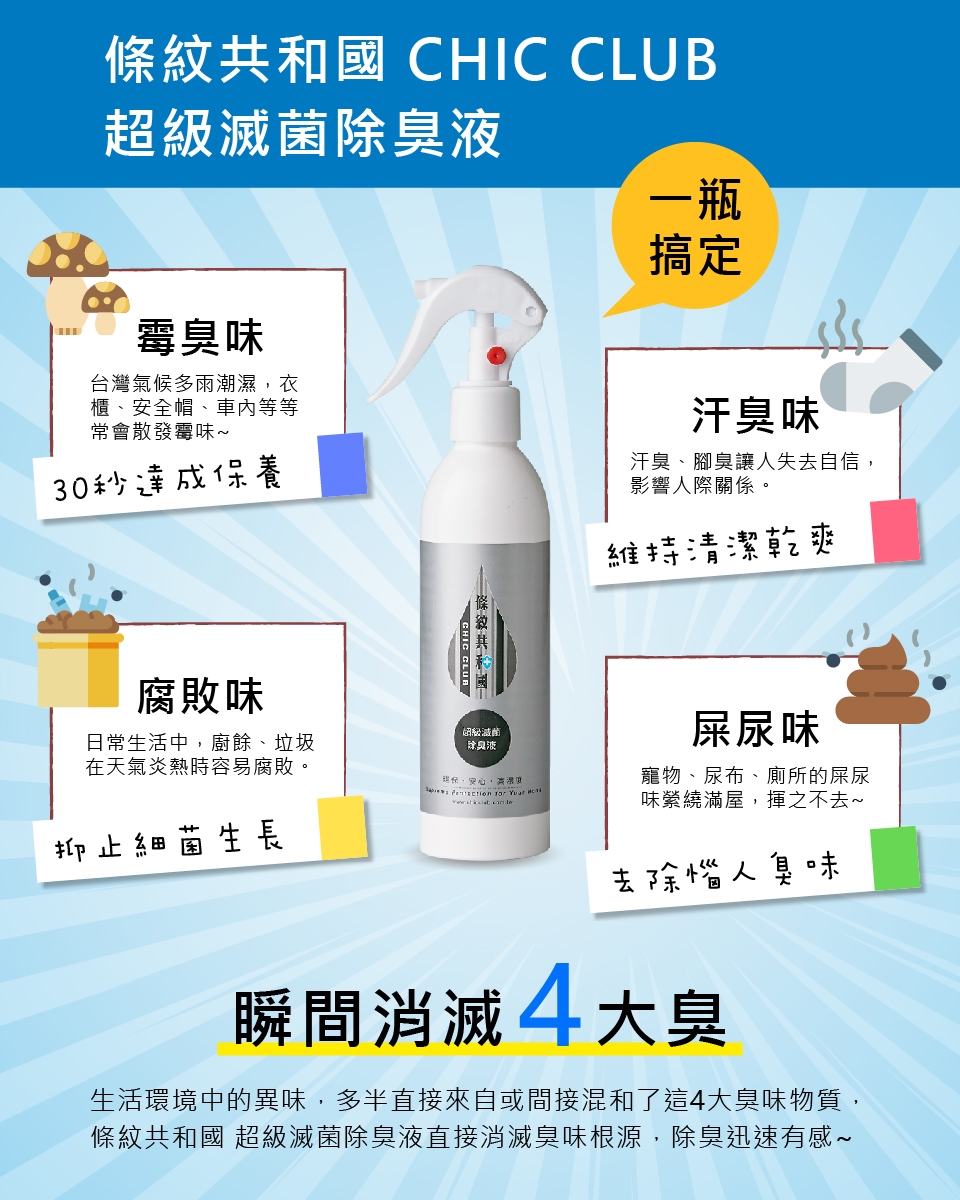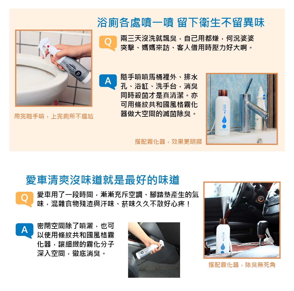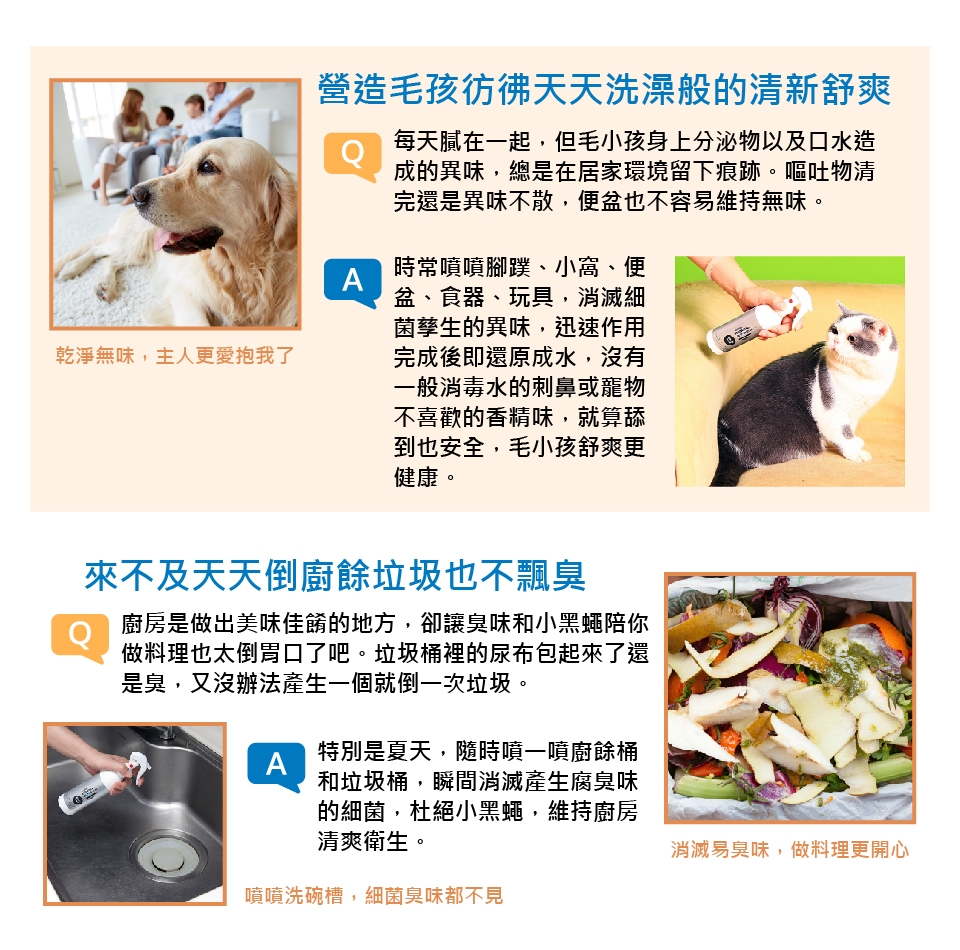 使用方法:直接均勻噴灑於異味環境或用品上,例如:鞋櫃、衛浴室、鞋子內側、垃圾桶、廚餘桶、寵物環境、汽車內部等。