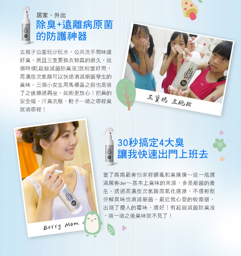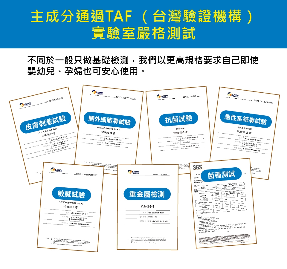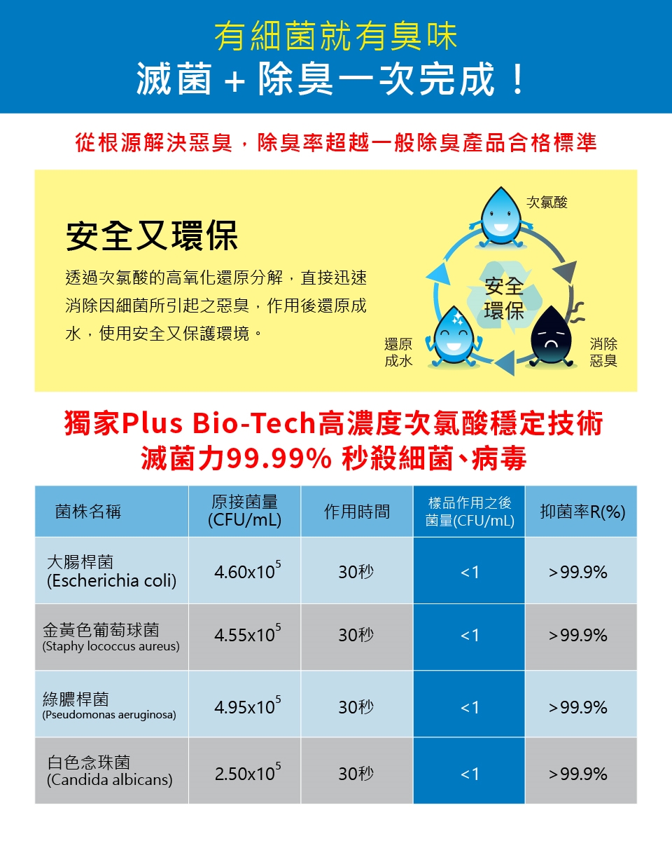 主要成分:Plus Bio-Tech 高濃度電解氧化水(HClO)。不含酒精、三氯沙、氯己定與化學香料等成分。