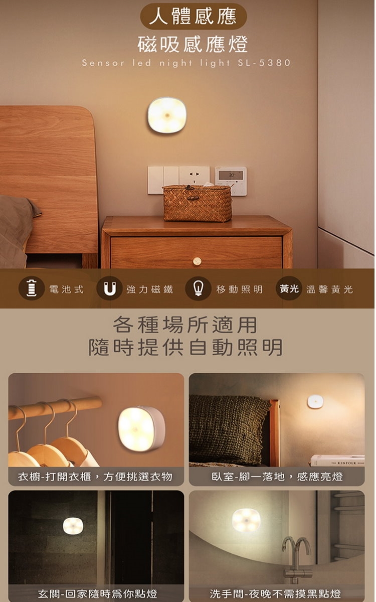 【KINYO】電池式磁吸LED人體感應燈-黃光(SL-5380)
