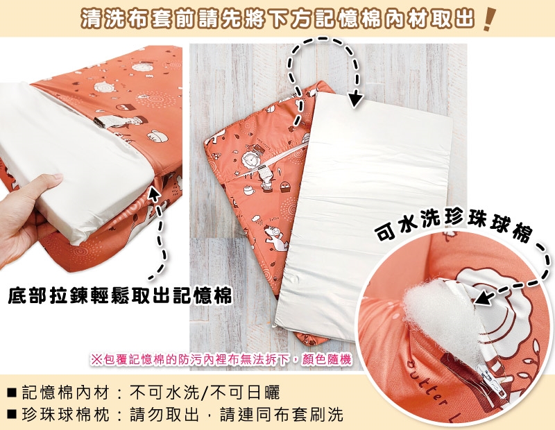 1. 記憶棉內材:不可水洗/不可日曬/清洗布套前請先將下方記憶棉內材取出。
