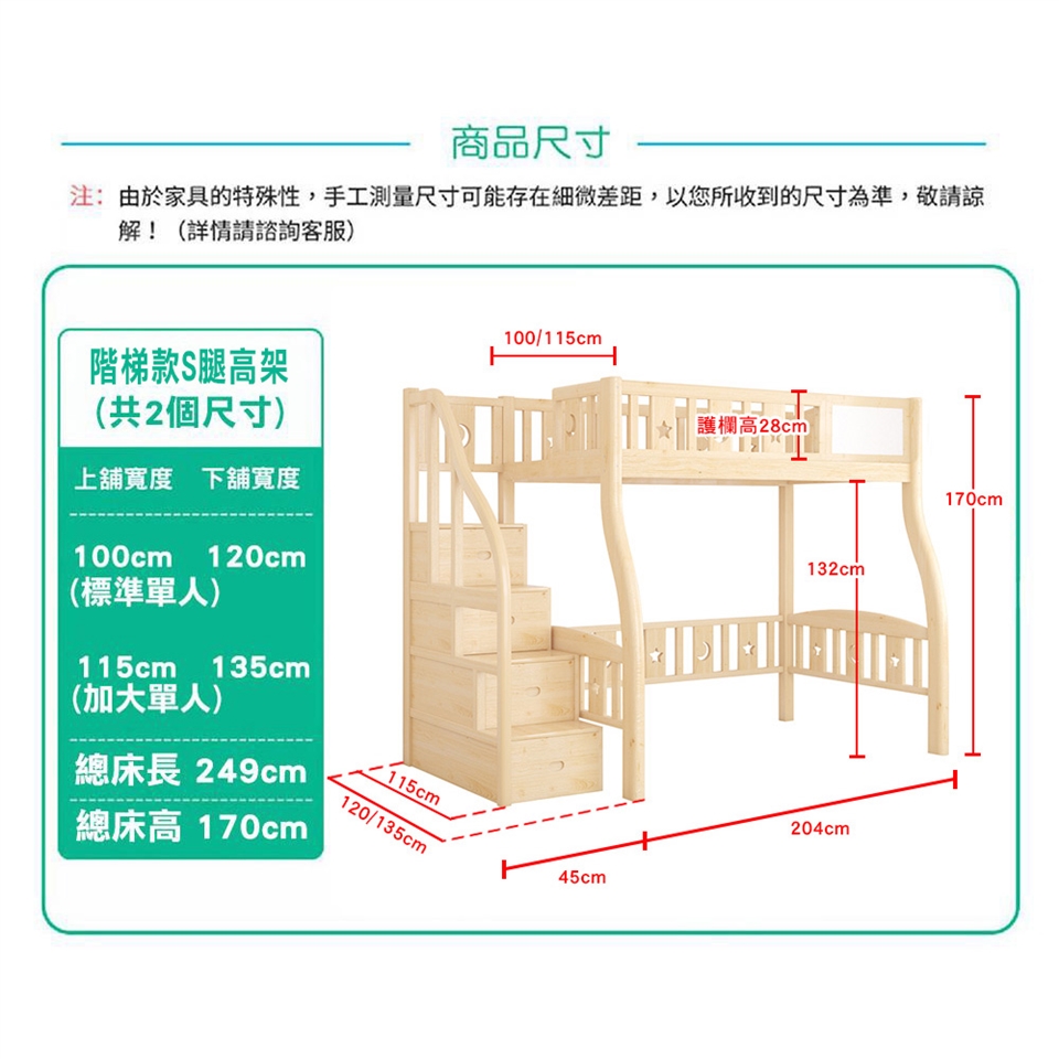 上鋪寬度115公分,下面空間寬度135公分,總長度249公分,床總高度170公分