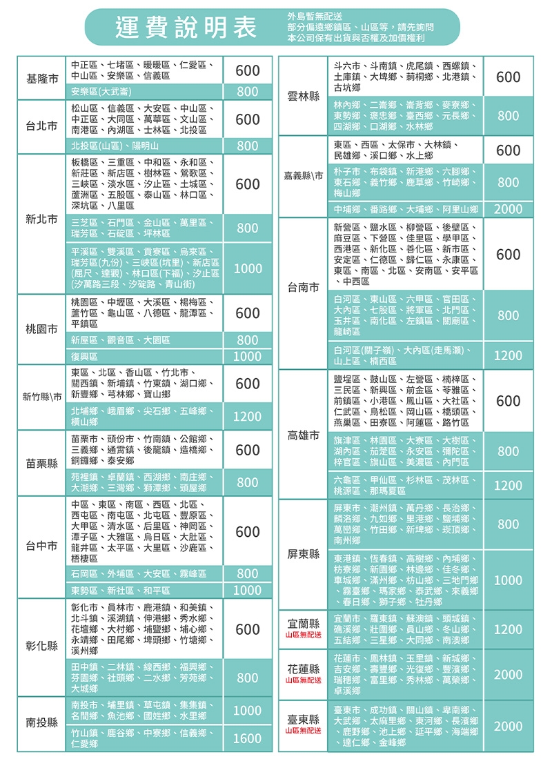 3.商品不包含運費及樓層費,費用依下方運費表各地區做為收費標準
