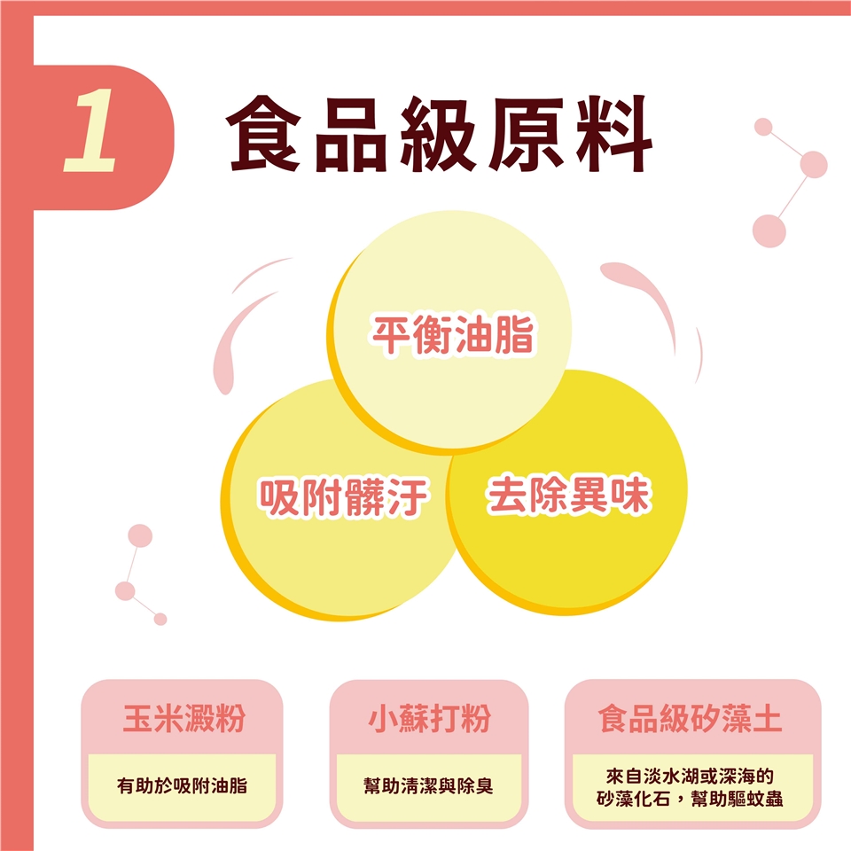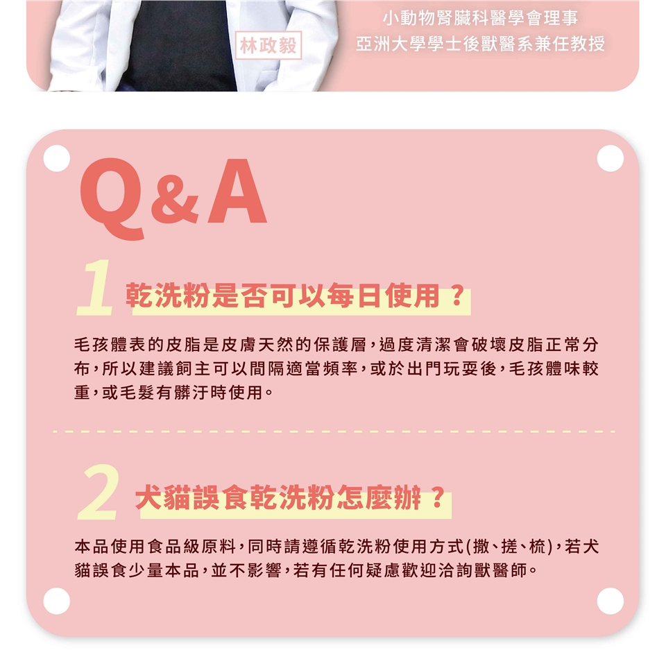 先確定寵物的毛為乾燥狀態,再將乾洗粉輕灑至寵物身上,需注意避開眼睛和耳