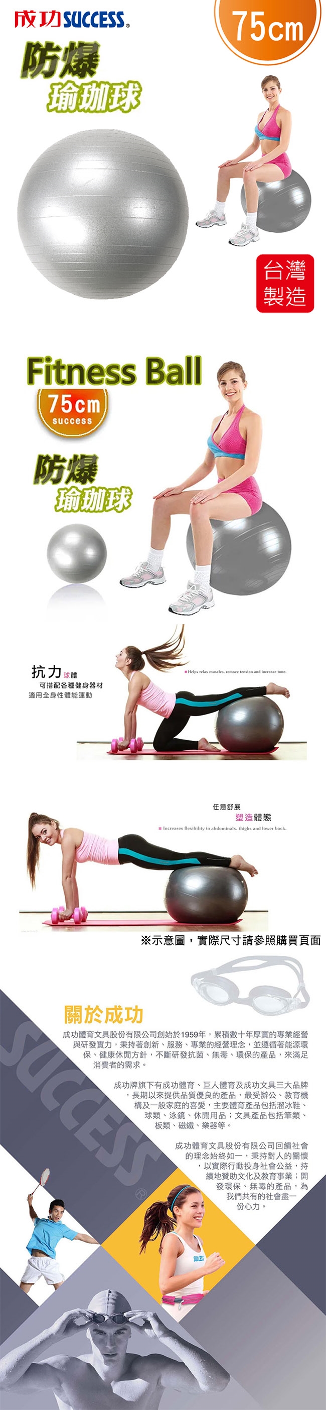 成功SUCCESS 75cm安全防爆韻律球 附打氣筒 S3807台灣製(身高高於180cm適用)