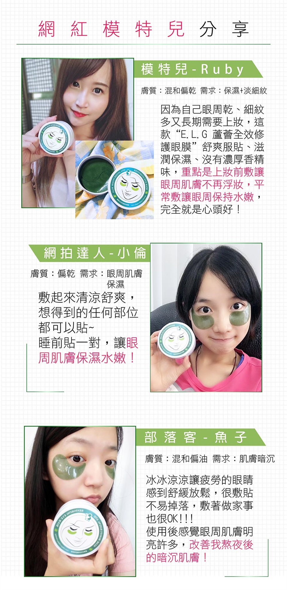 商品詳細介紹 使用方法說明 1.清潔眼周部分2.取出眼膜3.從眼頭到眼尾輕按貼合4.待15-20分後,取下眼膜5.搭配眼霜使用效果更佳 注意事項 敏感肌膚請先做局部肌膚測試,如有不適請停止使用並洽詢專業醫師。