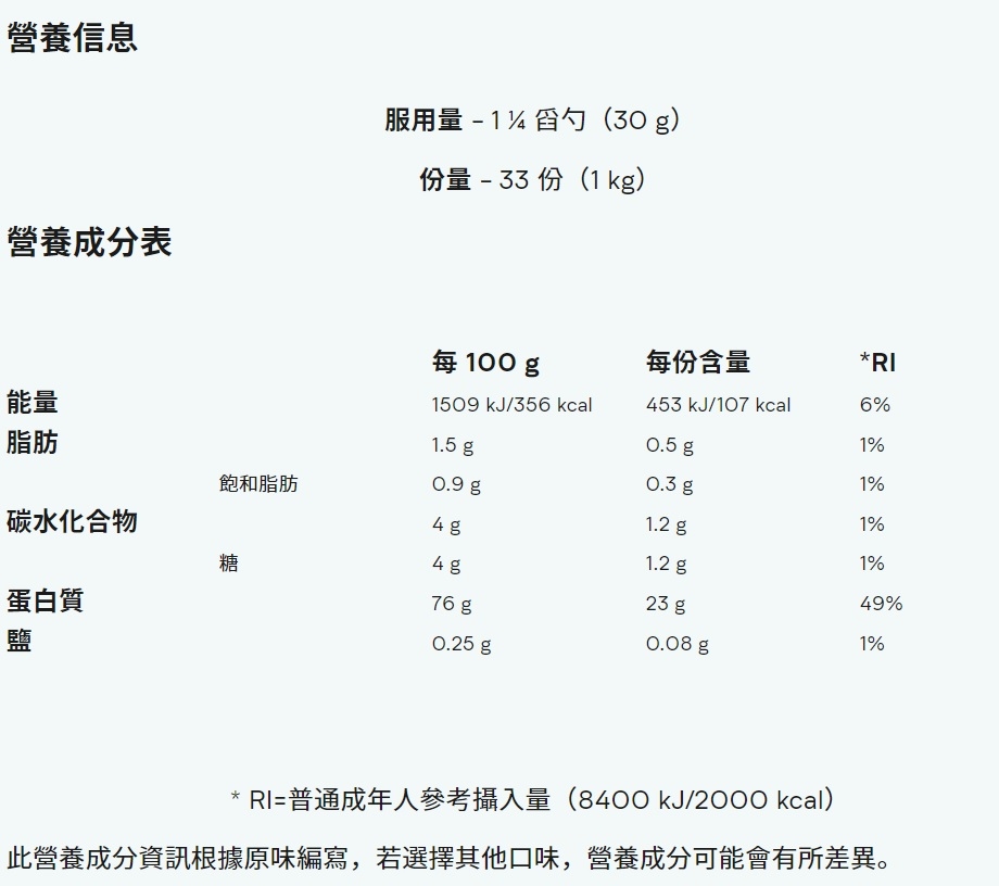 此蛋白補充劑具有完整氨基酸組分並含有豐富的支鏈氨基酸(BCAAs)。每餐份緩釋酪蛋白含高達 23 克蛋白,可增加質量。