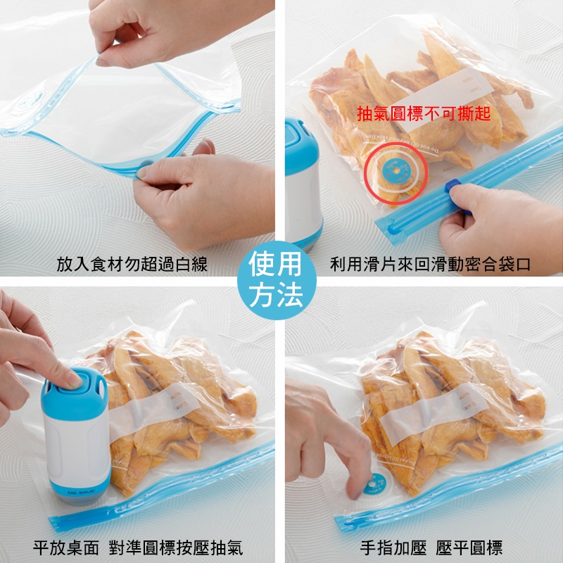 1.真空生鮮肉品:先把肉品用保鮮袋分裝好再依序置入食品袋中,切勿過分抽取避免抽入血水。
