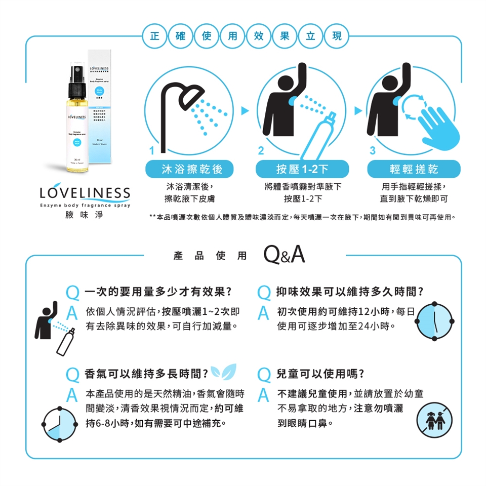 **本品噴灑次數依個人體質及體味濃淡而定,每天噴灑一次在腋下,期間如有聞到異味可再使用。