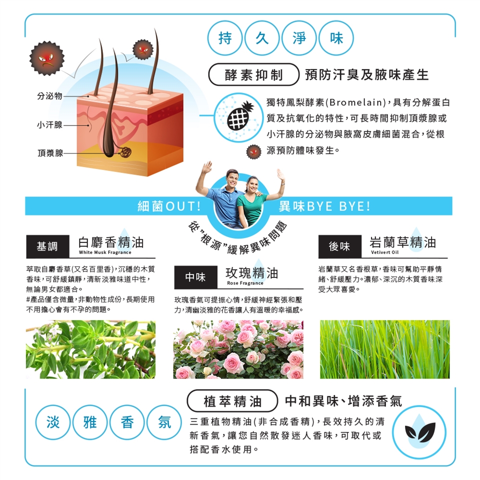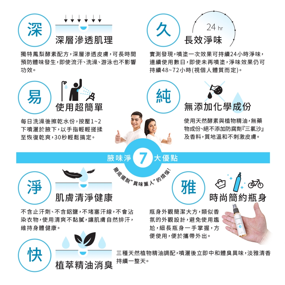 **本品噴灑次數依個人體質及體味濃淡而定,每天噴灑一次在腋下,期間如有聞到異味可再使用。