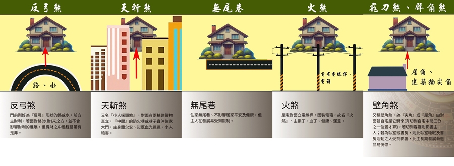 5.巷沖及璧刀煞:主血光意外之災,面對煞氣切進處掛山海鎮化解。