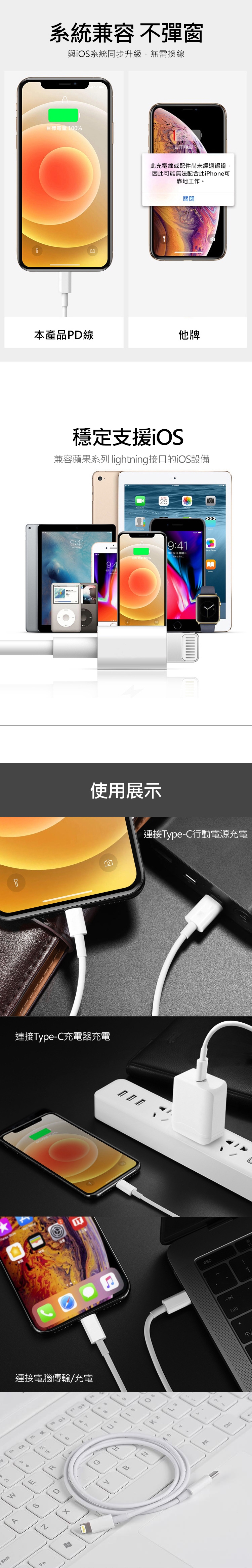 ※此充電線支援iPhone 8 / iPhone 8 Plus / iPhone X / iPhone XR / iPhone XS / iPhone XS Max / iPhone 11 / iPhone 11 / iPhone 11 Pro Max/ iPhone 12/ iPhone 12 Pro/ iPhone 12 Pro Max/ iPhone 12 mini...,須搭配支援PD的充電器,購買前請用戶自行確認是否具備此規格之充電器