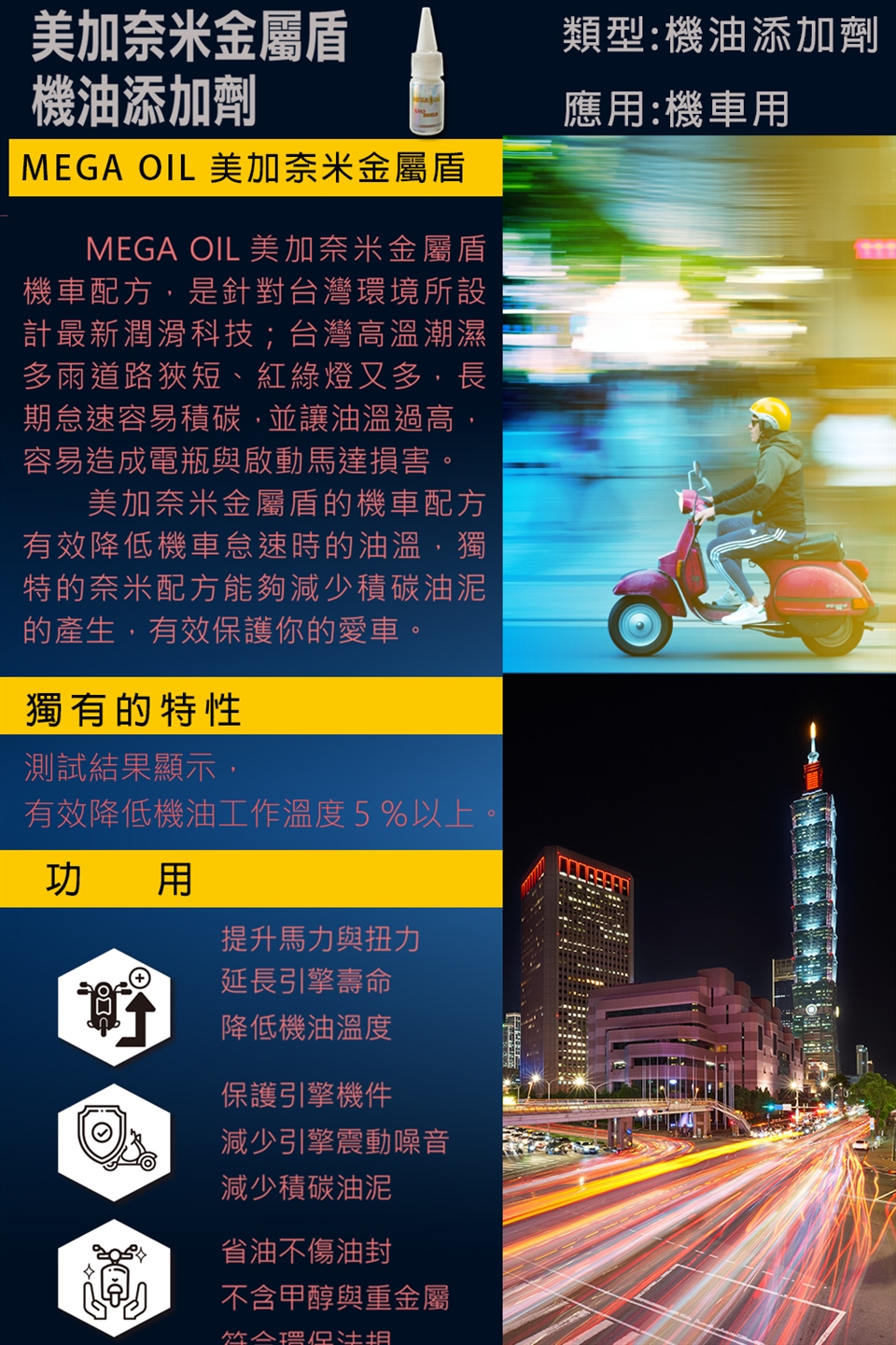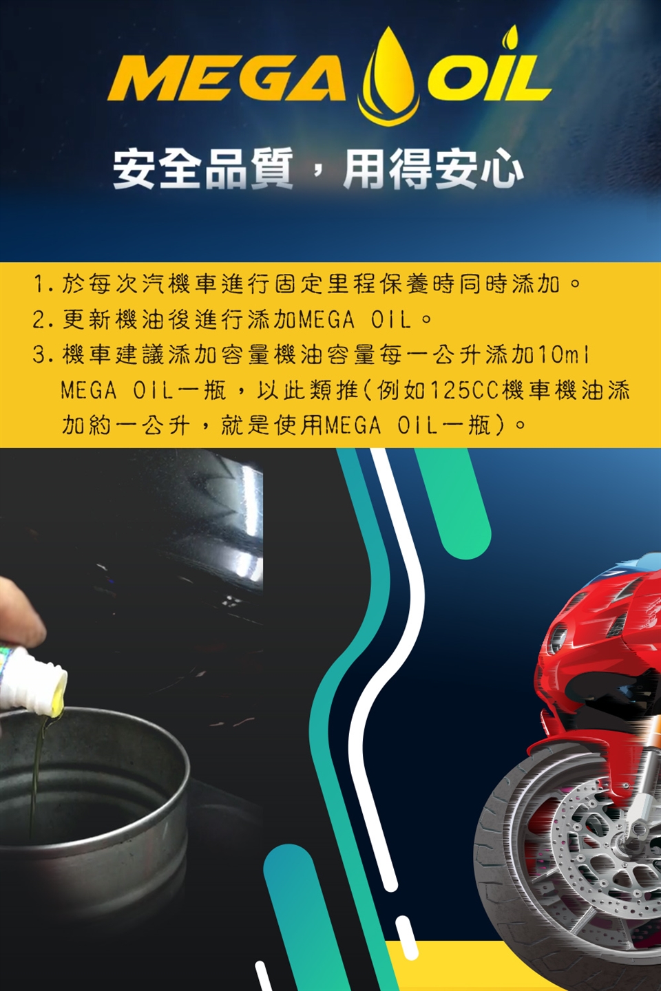 3.建議添加容量機油容量每一公升添加10mlMEGA OIL一瓶,以此類推(例如125CC機車機油添加約一公升,就是使用MEGA OIL一瓶)。