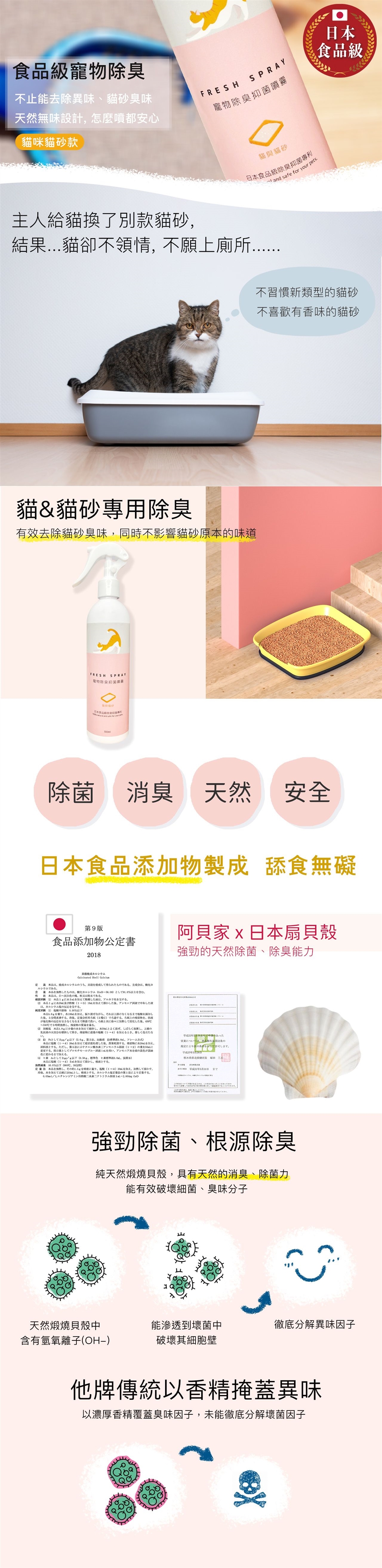 即使噴在貓砂上也不影響貓砂本來的特性, 不用擔心主子不上廁所。