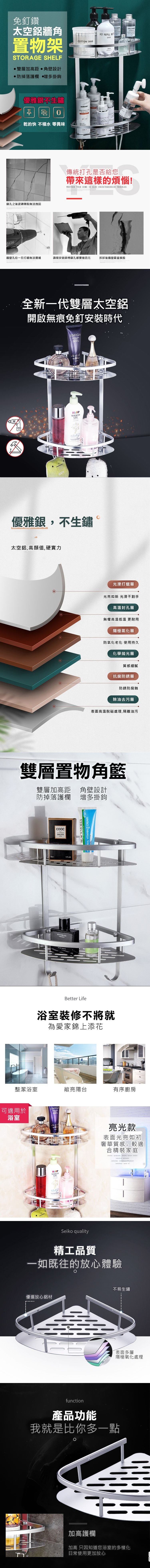 免釘鑽太空鋁牆角置物架,太空鋁材質  強力承重耐用 不生鏽,無論是木牆、水泥牆、玻璃、不鏽鋼、大理石、磁磚、牆紙...都好用,浴室、廚房或臥室裡的肥皂、髮梳、洗髮乳、化妝、卸妝品都好安放,讓室內更加整潔有條理!
