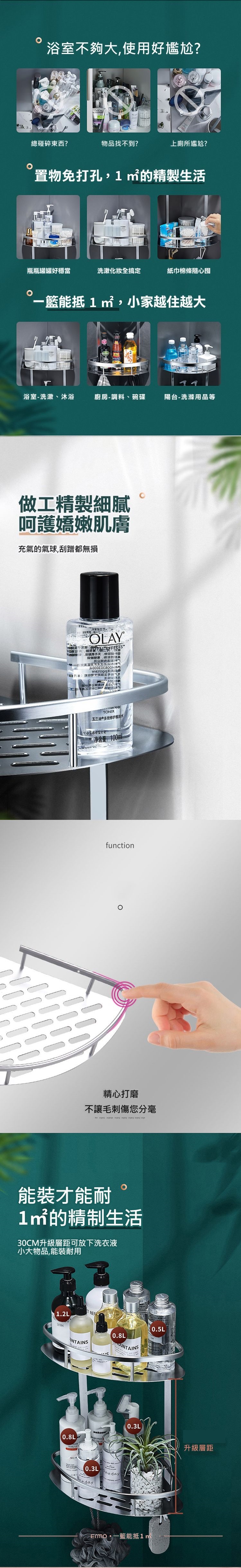 容量大,大瓶小瓶都能裝;置物架設有漏水孔,不怕積水;底設掛鉤,洗浴刷、鏟勺、抹布皆可掛;居家收納生活必備