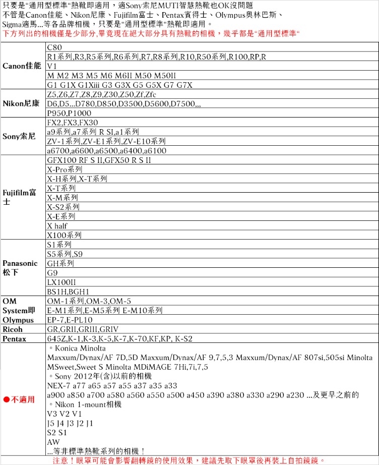 ●不適用Minolta/舊索尼和Nikon尼康1系列...等非標準熱靴系列的相機!