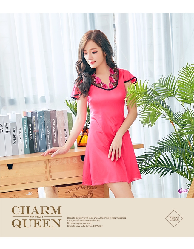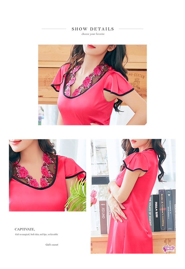 領口處黑色網紗搭配桃紅花朵刺繡,