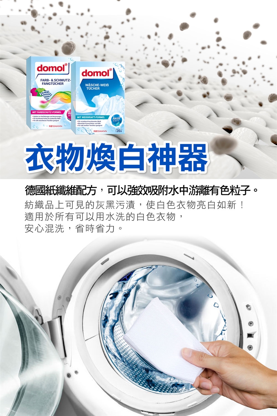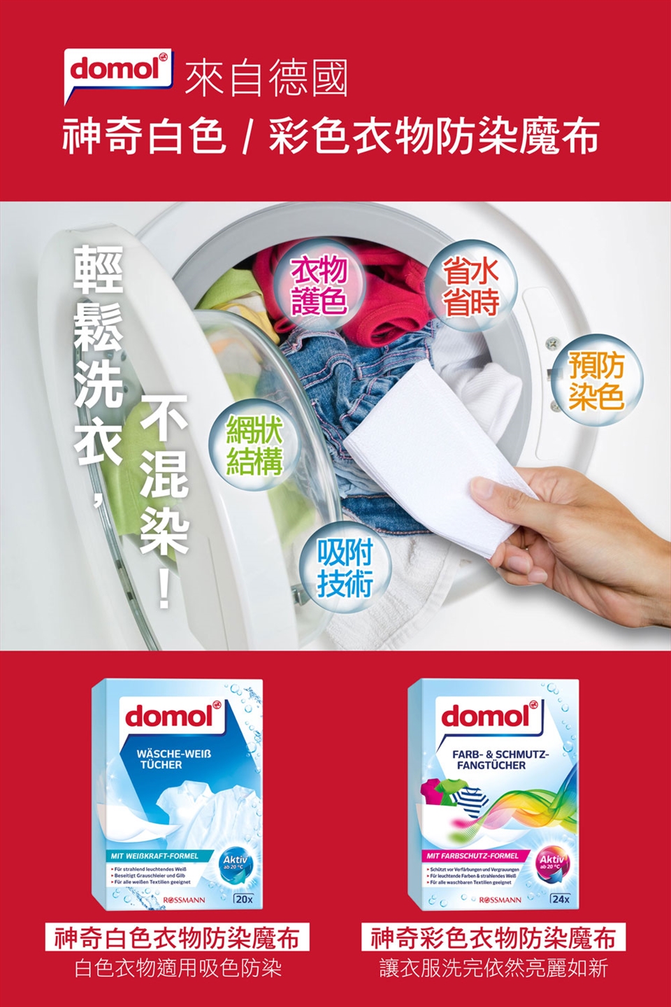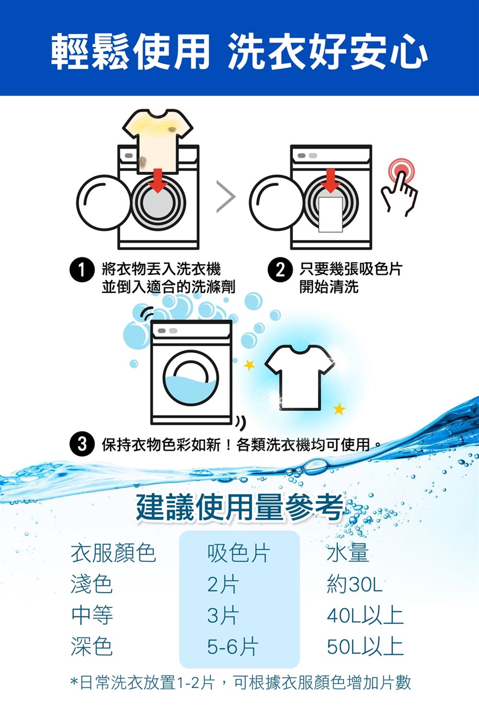 打開紙盒後取出適量防染布並投入洗衣機滾筒處,中滴水位使用量約2張/每次,中高水位以上請使用3-4張/每次。僅供單次使用,勿重複使用,用後請丟棄製垃圾桶。