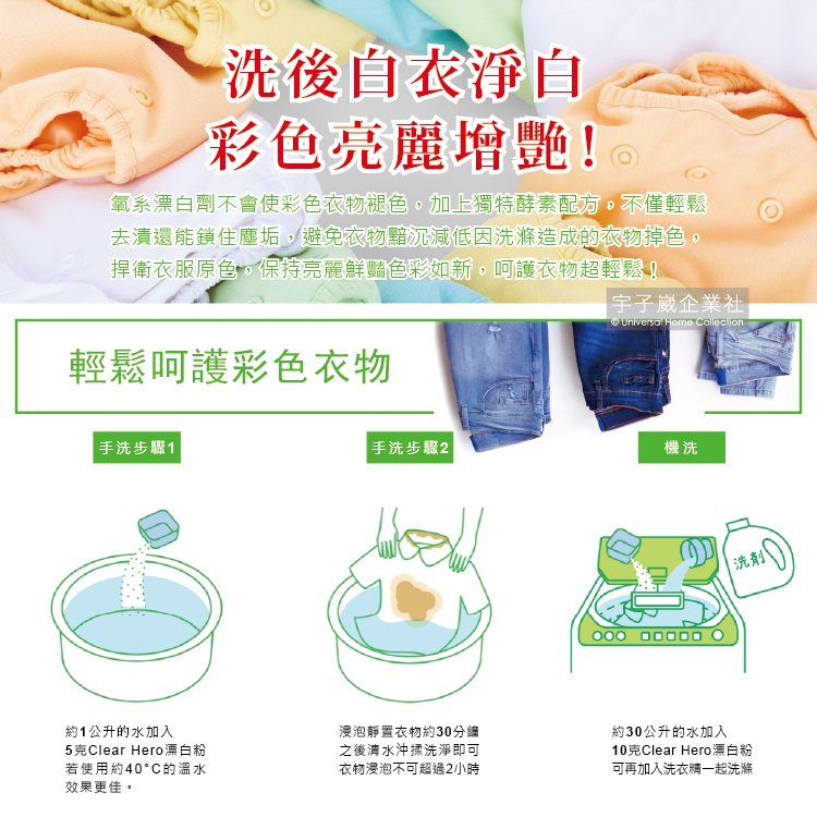 3.適用衣料 : 棉、麻、合成纖維(能水洗的白色衣物、彩色衣料、花紋圖案衣料都可)