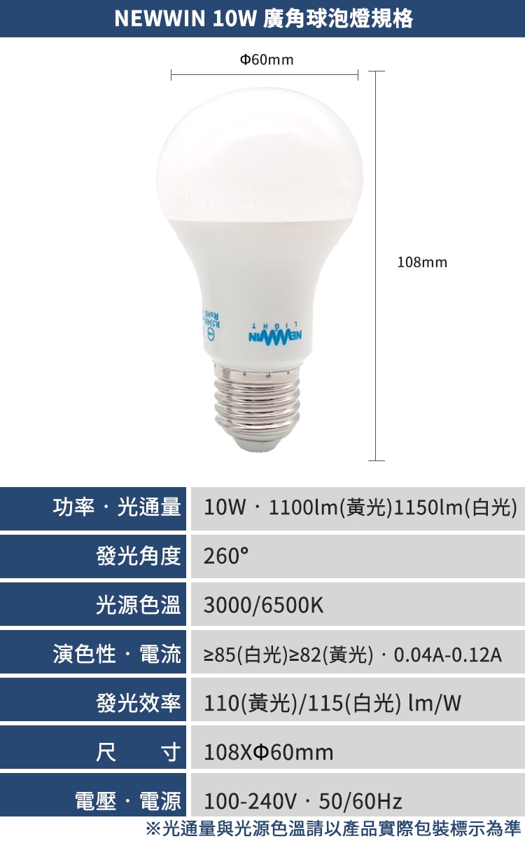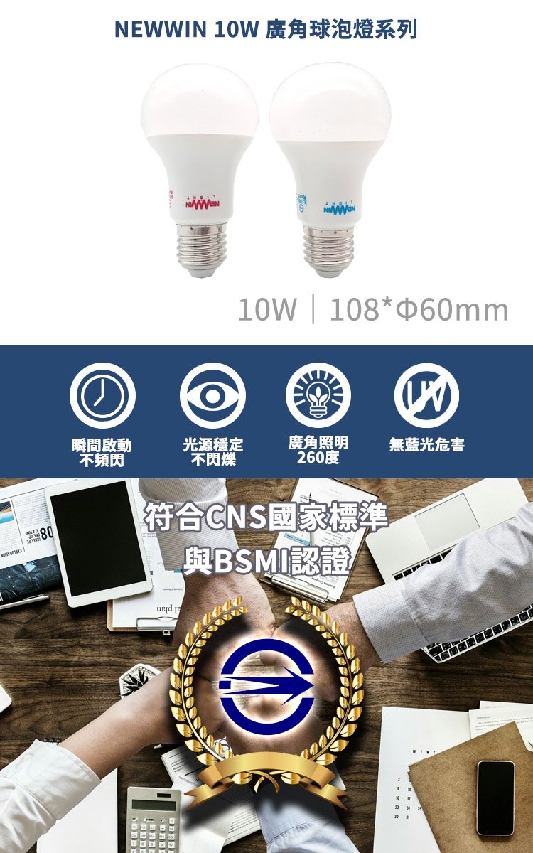 台灣製NEWWIN全電壓10W LED廣角球泡燈,