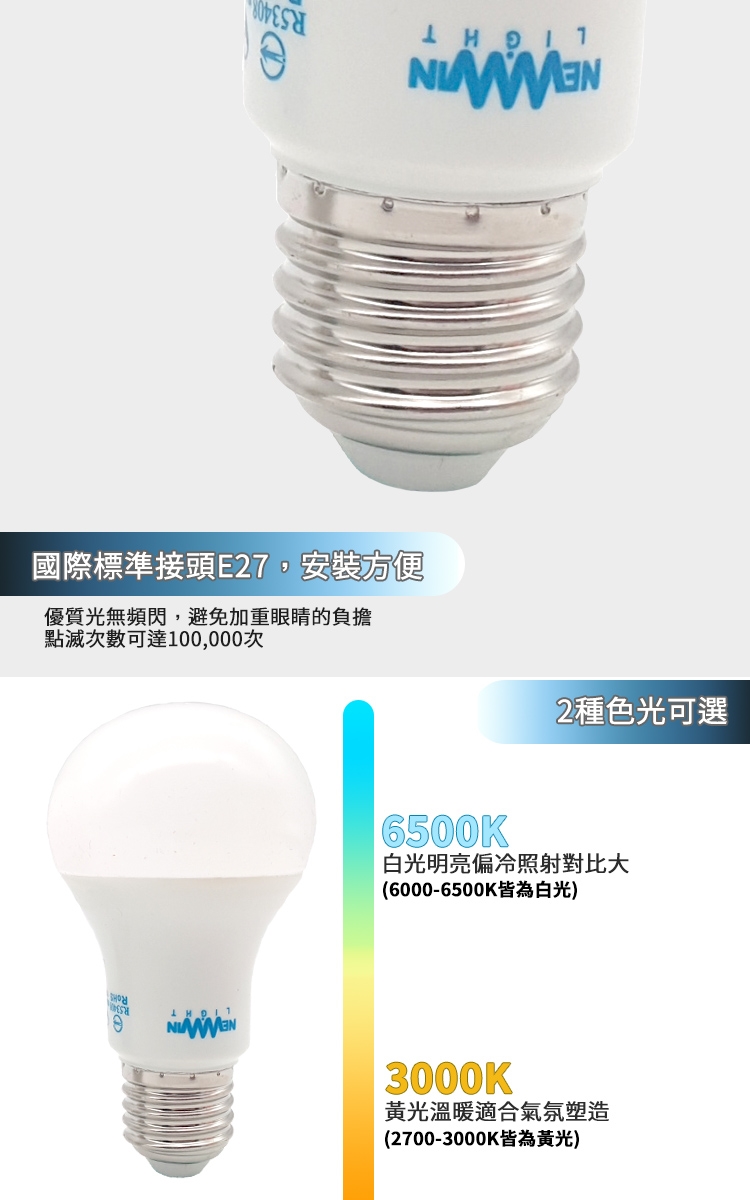 燈泡為國際標準E27接頭,適用多種燈座,有白黃光兩色可選,經濟實惠!