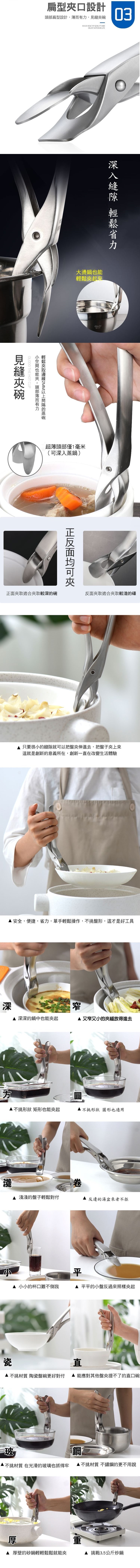 不鏽鋼強力防燙夾,新拉絲工藝不鏽鋼,一體成形,堅固耐用,採以力學原理,無論容器大小、材質,一夾就緊,再窄的縫隙也能輕鬆夾起,讓您再也不怕從鍋裡或微波爐裡拿取滾燙的碗盤時燙到手,是您廚房的便利好幫手!