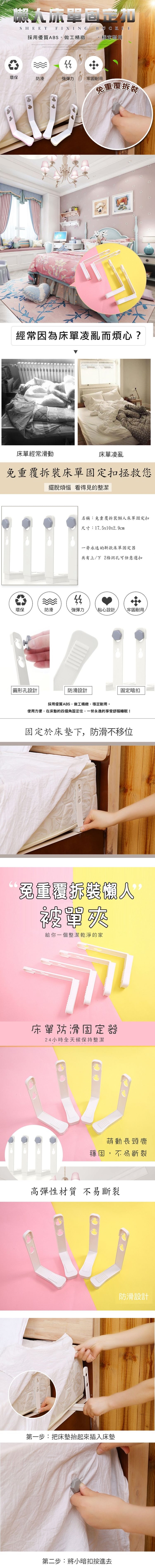 免重覆拆裝懶人床單固定扣,暗扣式設計,只需安裝一次,之後換床單只需將暗扣扣上即,不像舊款的需每換一次就要安裝一次,累都累屬人囉,彈力堅固耐用,置於床墊下穩固不脫落,而且安裝方法簡單易懂,不傷床單!造就媲美飯店等級的平整床單,為你省去每天整理床單的困擾!