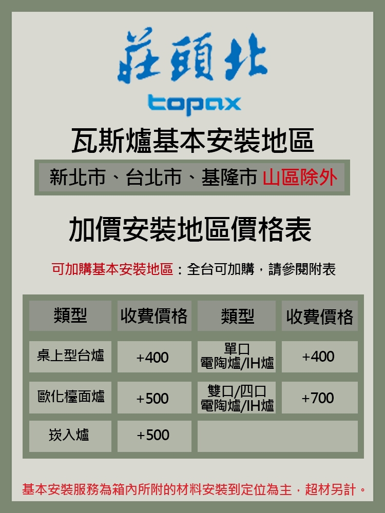 •下訂單前請先確認好家中位置尺寸,或可來電詢問,若安裝人員到現場因氣別或尺寸不合無法安裝,則需酌收工本費400元整。